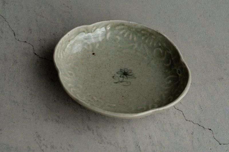 このお皿のリムに刻まれた陽刻が深い瑠璃色をより印象的に映し出します。