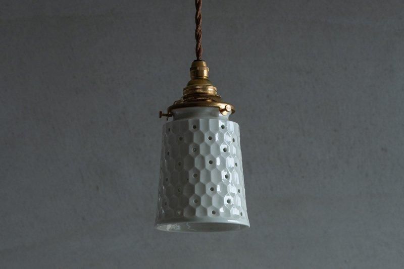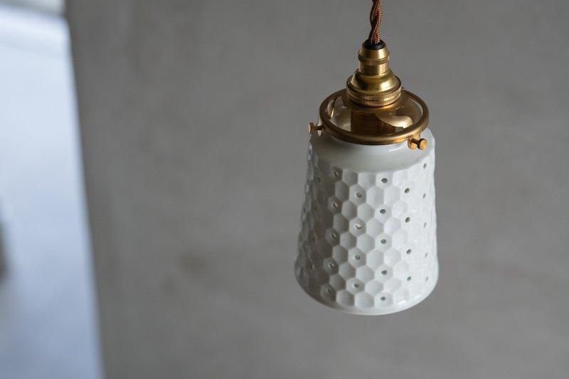 阿部春弥さんのランプシェードは磁器製ですので透光性があり、点灯すると電気の明かりが透けて表情に変化が生まれます。